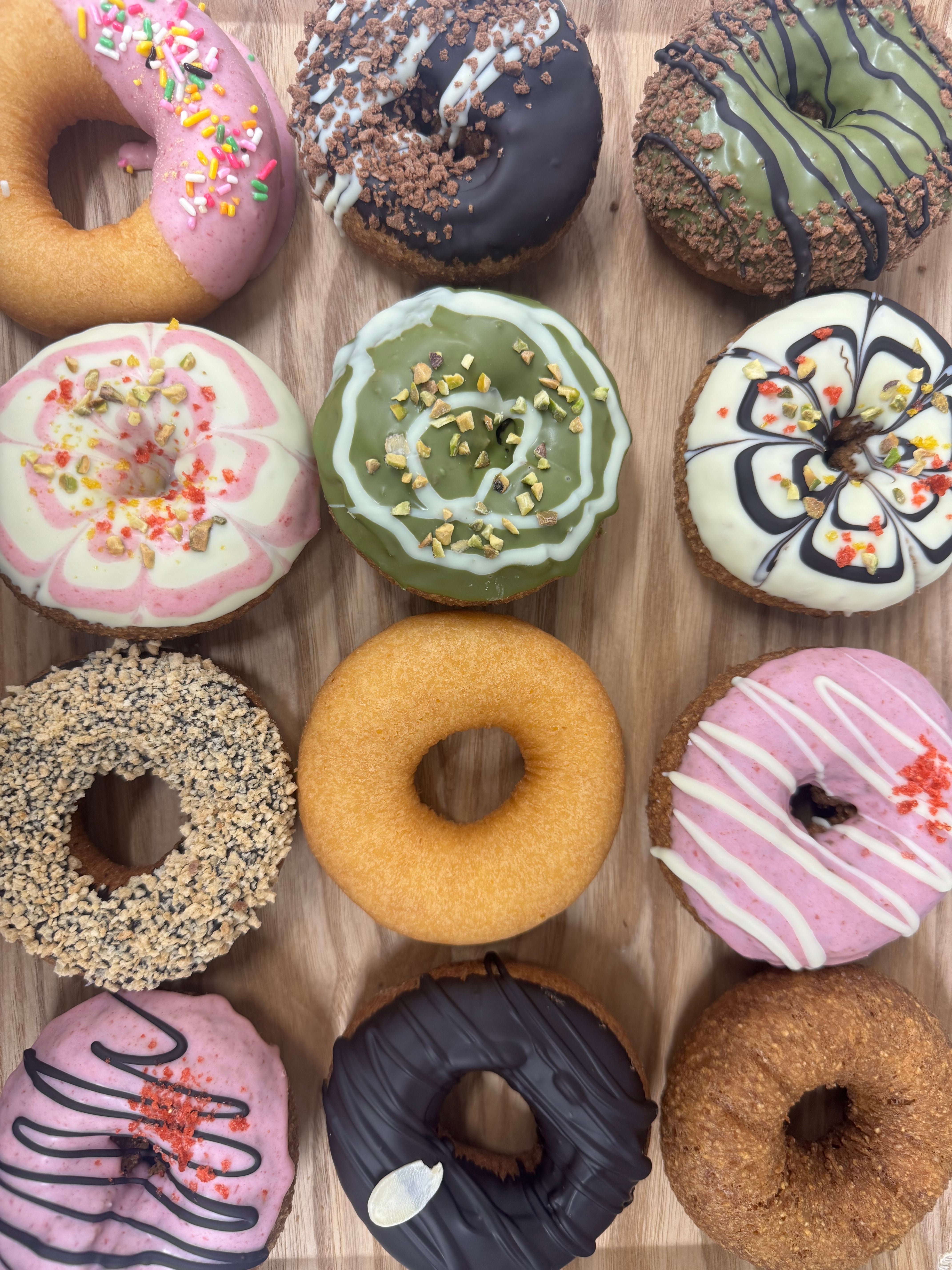 全粒粉生地、とうふ生地、とうふバナナ生地のドーナツの詰め合わせ